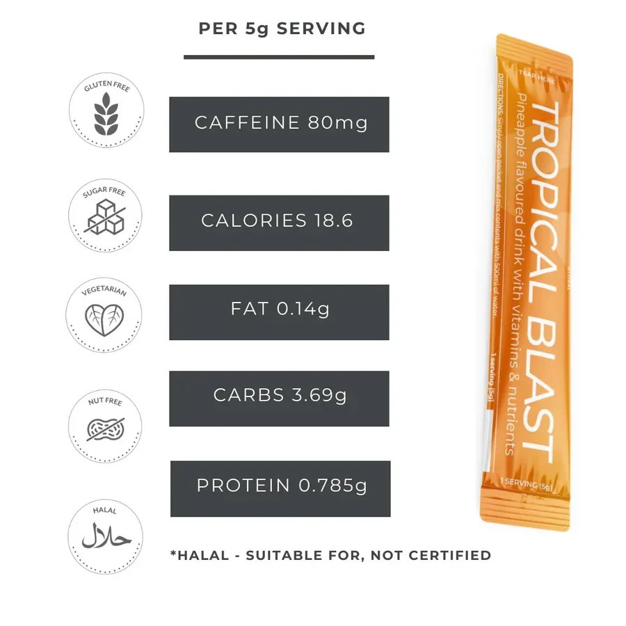Ervaar de kracht van de natuurlijke ingredienten van Valentus Tropical Blast Cocktail.Deze formule helpt je je honger gevoel te stillen,ondersteunt de vetverbranding en geeft je een energieboost.Daarnaast draagt het bij aan een betere focus,goed humeur en een sterk immuunsysteem.